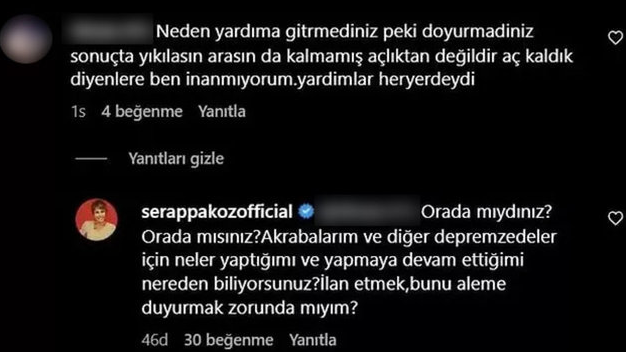 Ünlü sunucu Serap Paköz Kahramanmaraş merkezli depremde halasını kaybettiğini duyuran bir paylaşımda bulundu. Ünlü isim sosyal medya hesabından yaptığı paylaşımın ardından pek çok seveninden taziye mesajları alırken bir takipçisinin eleştirine ise kayıtsız kalamadı. Serap Paköz takipçisinin “neden yardıma gitmediniz peki, doyurmadınız, şeklindeki yorumuna, orada mıydınız? Orada mısınız? Akrabalarım ve diğer depremzedeler için neler yaptığımı ve yapmaya devam ettiğimi nereden biliyorsunuz? İlan etmek, bunu aleme duyurmak zorunda mıyım” ifadelerini kullandı.