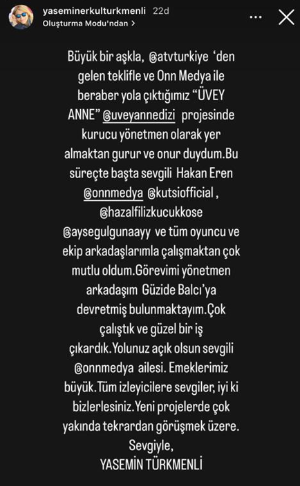 Televizyon ekranlarında yayınlanan dizilerin sezon finali yapmasıyla birlikte ekranlara yazlık diziler gelmeye başladı. Kanallar birbirinden iddialı yeni dizileri seyirciyle buluştururken bu dizilerden biri de Atv ekranlarında yayınlanan ve pazartesi akşamları seyirciyle buluşan Üvey Anne adlı dizi oldu. Kadrosunda Kutsi, Hazal Filiz Küçükköse gibi ünlü isimleri buluşturan dizinin ilk hazırlığından itibaren yönetmen koltuğunda başarılı yönetmen Yasemin Türkmenli yer aldı. Başarılı yönetmen dizinin ilk anından itibaren kurulumunu yaptı ve ardından da ilk bölümlerinin yönetmen koltuğunda oturdu. Ancak dizinin ilerleyen bölümleriyle birlikte yapım şirketi ONN Medya dizide yönetmen değişikliğine gitme kararı aldı ve yönetmen Yasemin Türkmenli yerine Güzide Balcı’yı dizinin yönetmenliğine getirdi. Bu durumun ardından başarılı yönetmen Yasemin Türkmenli bir veda mesajı yayınladı.