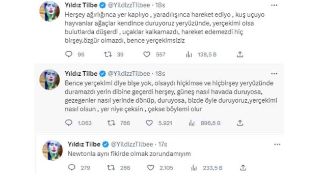 Sosyal medya paylaşımlarıyla sık sık gündeme gelen ünlü şarkıcı Yıldız Tilbe bu sefer de yer çekimi yasasıyla ilgili paylaşımlarıyla gündemde. Yer çekimi olmadığını iddia eden şarkıcı sosyal medya hesabından bir paylaşım yaptı. Yıldız Tilbe paylaşımında “bence yer çekimi diye bir şey yok. Olsaydı hiç kimse ve hiçbir şey yeryüzünde duramazdı, yerin dibine geçerdi. Her şey, güneş nasıl havada duruyorsa, gezegenler nasıl yerinde dönüp duruyorsa biz de öyle duruyoruz. Yer çekimi nasıl olsun, yer niye çeksin, çekse böyle mi olur? Her şey birbirini gayet itiyor bence. Bir çekim değil de itim gücü var. Bence yer bizi itiyor, gök de. Farkında değiliz, yoksa yürüyemezdik. Kuşlar, uçaklar uçmazdı. Newton’la aynı fikirde olmak zorunda mıyım” ifadelerini kullandı. Ünlü ismin bu paylaşımları kısa sürede binlerce beğeni, yorum alırken Yıldız Tilbe de magazin basını ve sosyal medyada gündem olmayı başardı.