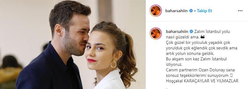 Zalim İstanbul 39 bölüm çekildi ve heyecan dolu hikaye oldukça trajik bir sonla tamamlandı. Son bölümde ölen Ceren karakteri ise dizinin sıra dışı karakterlerindendi. Bahar Şahin dizinin final gününde paylaştığı veda mesajında, "Zalım İstanbul yolu nasıl güzeldi ama. Çok güzel bir yolculuk yaşadık çok yorulduk çok eğlendik çok sevdik ama artık yolun sonuna geldik. Bu akşam son kez Zalım İstanbul izliyoruz. Canım partnerim Ozan Dolunay sana sonsuz teşekkürlerimi sunuyorum. Hoşçakal KARAÇAYLAR VE YILMAZLAR" ifadelerini kullandı. Bahar Şahin sosyal medya platformu İnstagram'dan yaptığı paylaşımda partneri Ozan Dolunay ile birlikte samimi bir poz verdikleri bir fotoğrafla veda etti.